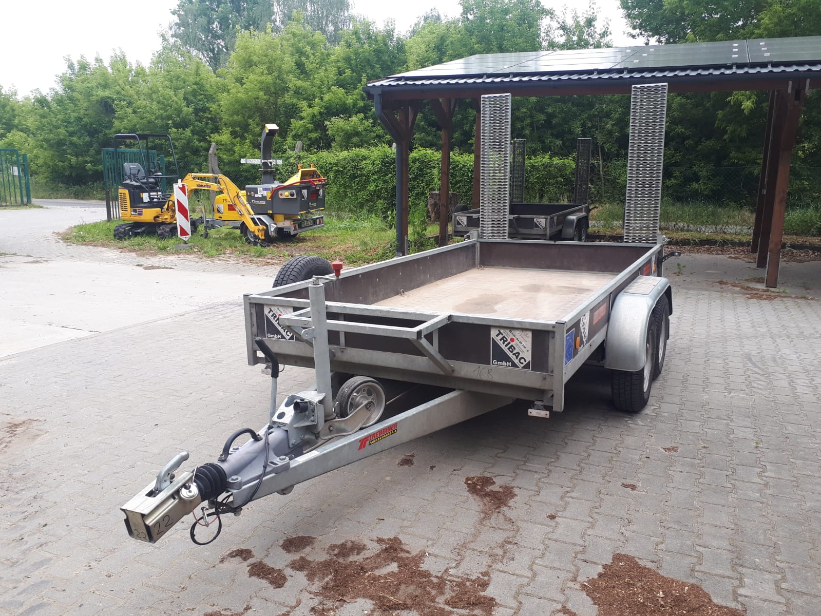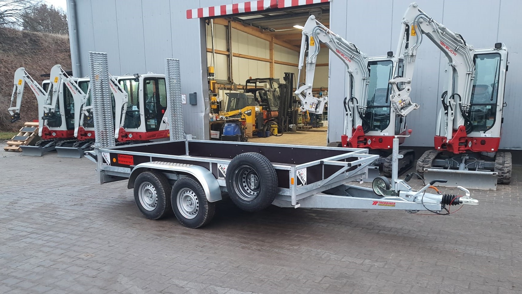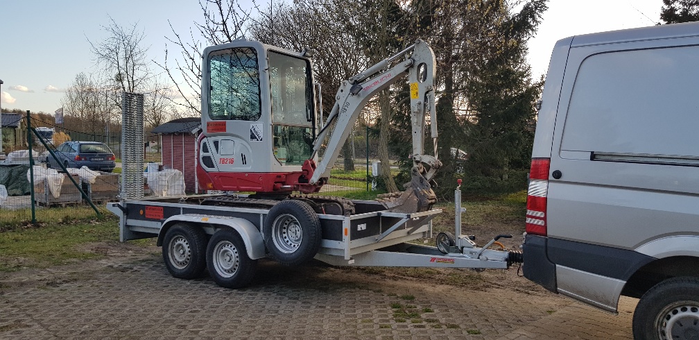 | Ausstattung | Baumaschinentransportanhänger, Gesamtmasse 3500kg, Nutzmasse ca. 2740kg (ohne Zubehör), Kasteninnenmaße ca. 3520x1750x300mm, 12V Beleuchtung 13-polig, Kotflügel verstärkt mit Trittblech, 6 versenkbare Verzurrösen (max. 800daN nach DIN EN 12640), schweres Stützrad (ca. 250kg Belastbarkeit), Bereifung 185R14C8PR und Reserverad, Auffahrrampen BT1750x300 mit Zwangsabstützung, Ablagekorb für Baggerschaufel, Erstzulassung: 17.06.2022 |