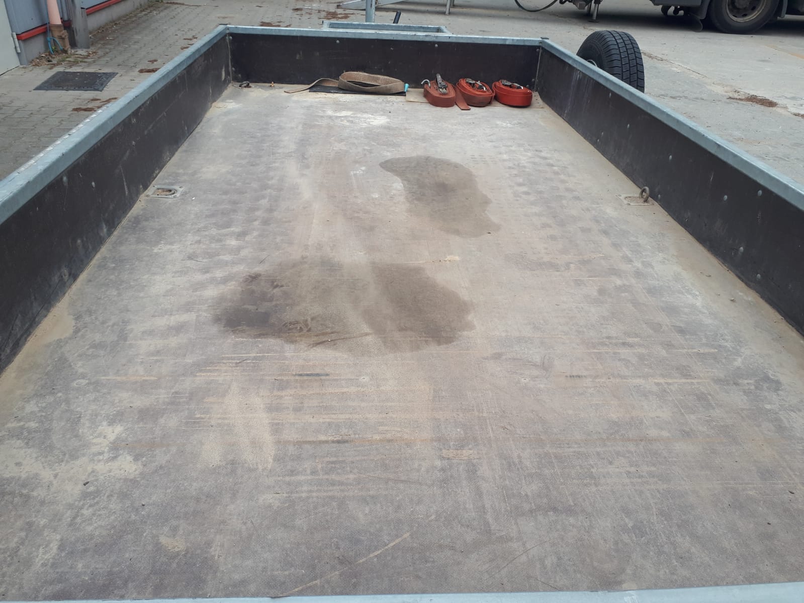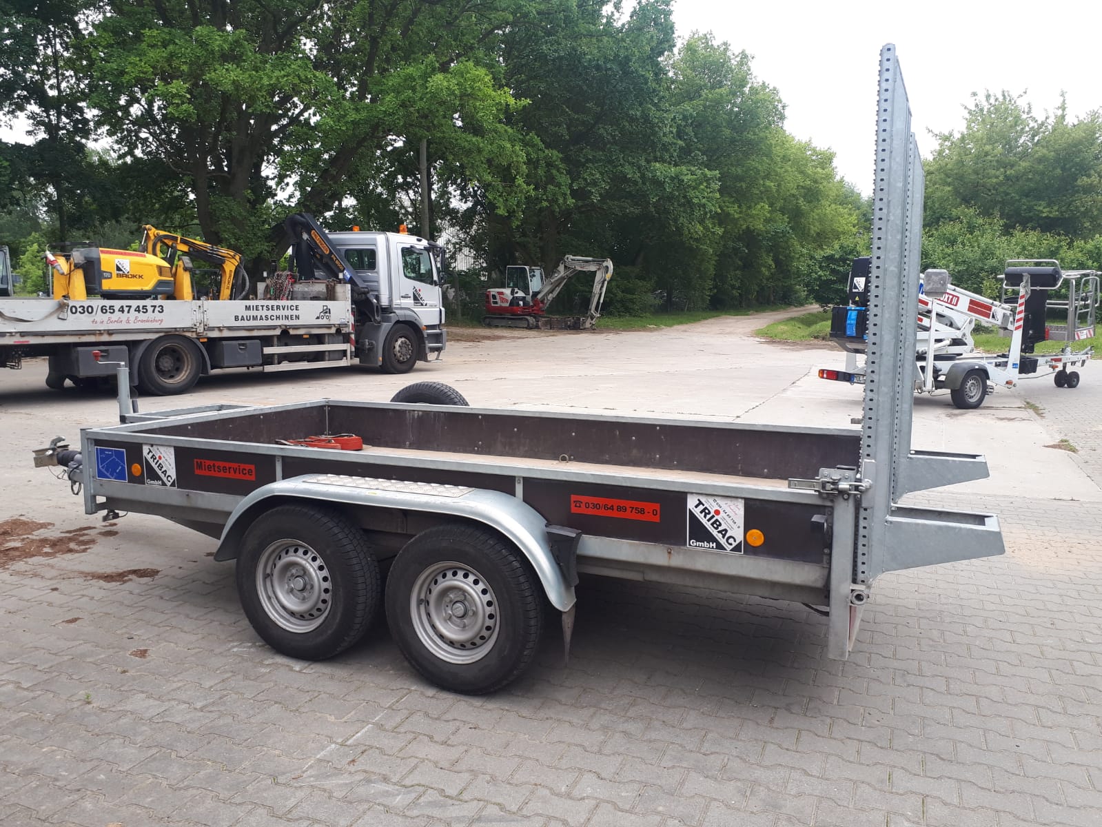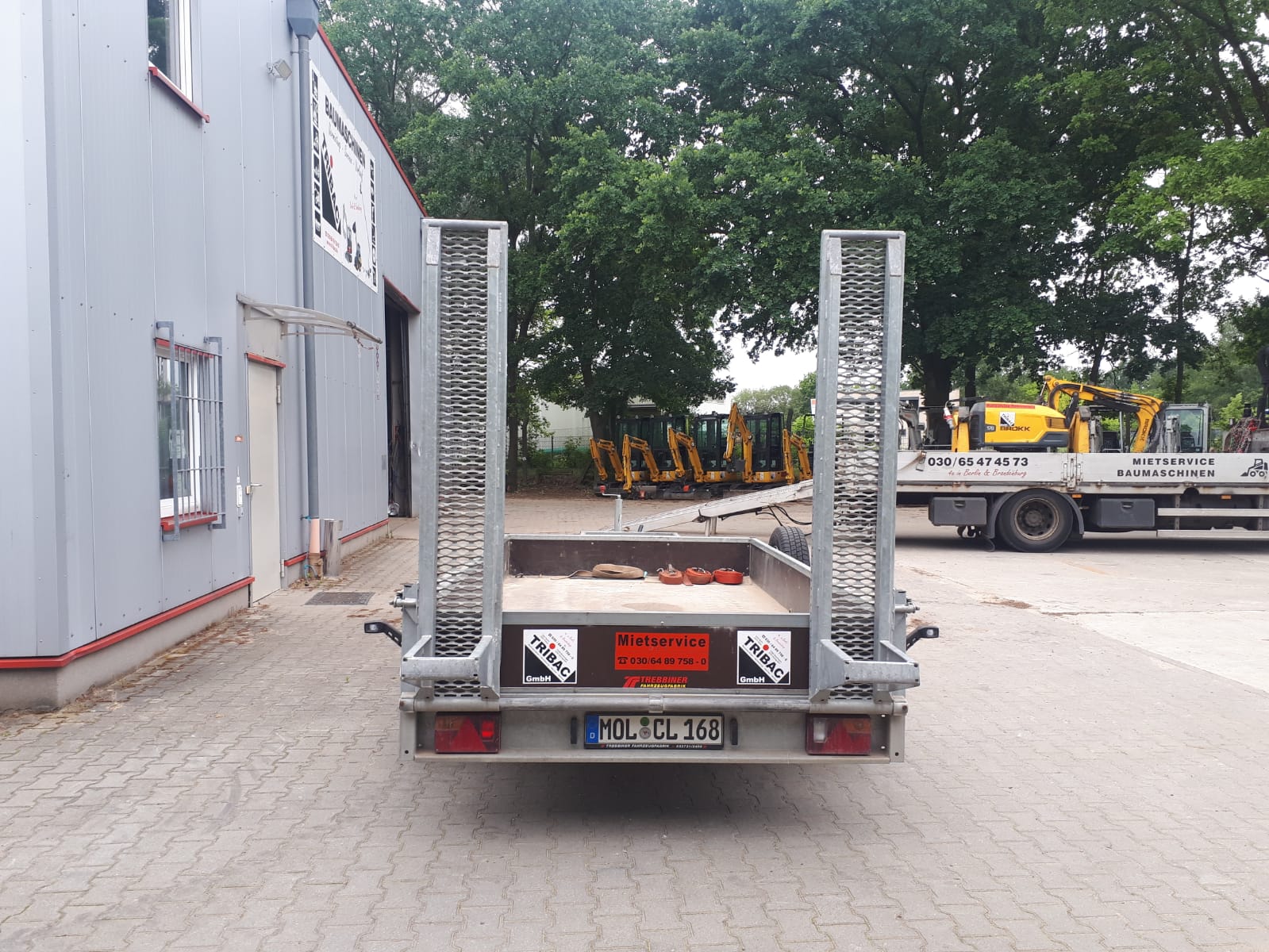 | Ausstattung | Baumaschinentransportanhänger, Gesamtmasse 3500kg, Nutzmasse ca. 2740kg (ohne Zubehör), Kasteninnenmaße ca. 3520x1750x300mm, 12V Beleuchtung 13-polig, Kotflügel verstärkt mit Trittblech, 6 versenkbare Verzurrösen (max. 800daN nach DIN EN 12640), schweres Stützrad (ca. 250kg Belastbarkeit), Bereifung 185R14C8PR und Reserverad, Auffahrrampen BT1750x300 mit Zwangsabstützung, Ablagekorb für Baggerschaufel, Erstzulassung: 17.06.2022 |