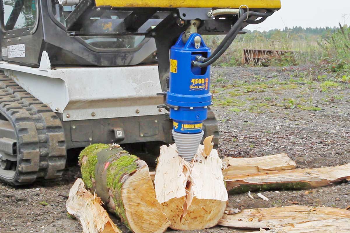 Mit dem für Bagger von 1 t – 5 t und für Kompaktlader geeigneten kompakten und robusten Holzspalter von Auger Torque ist es leicht, gefällte Bäume schnell und effizient in handliche Holzstücke zu verwandeln. Wenn sich der Holzspalter dreht, greift der selbstführende Gewindekörper in das Holz ein und zieht den Spalter in den Stamm. Aufgrund seiner konischen Form arbeitet er sich schnell durch den Baumstamm und spaltet ihn in zwei Hälften. Bei größeren Stämmen kann der Spalter umpositioniert werden, um den Spaltvorgang über die gesamte Länge des Stammes fortzusetzen. Der Holzspalter von Auger Torque ist ein Gerät, das sich schnell und einfach an Ihren Erdbohrer über die übliche Schaftwelle (65mm Rund) anbauen lässt.