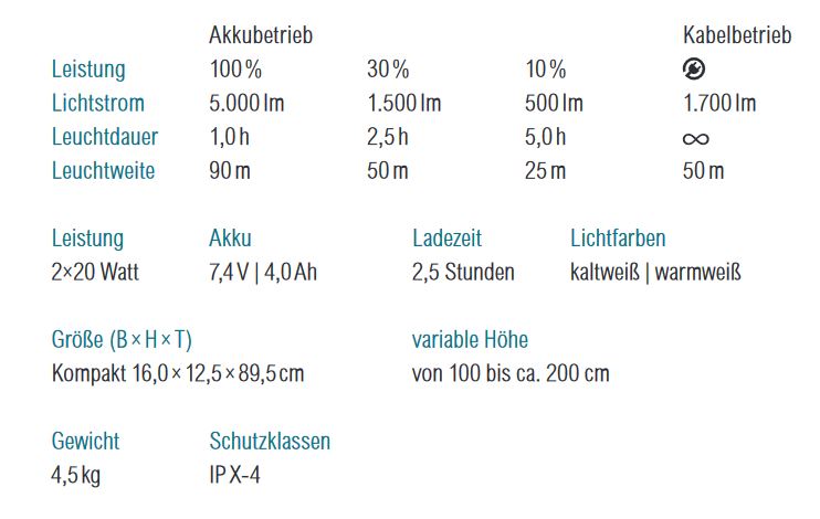 Mit dem professionellen Tower LUX LED-Teleskop Strahler lässt sich jeder geschlossene Raum, jede Baustelle oder Halle optimal ausleuchten. Der Strahler ist mit zwei individuell ausrichtbaren Leuchtköpfen von jeweils 20 Watt ausgestattet. Die zweiteilige Teleskopstange ermöglicht eine Maximalhöhe von ca. 2,0 Metern.