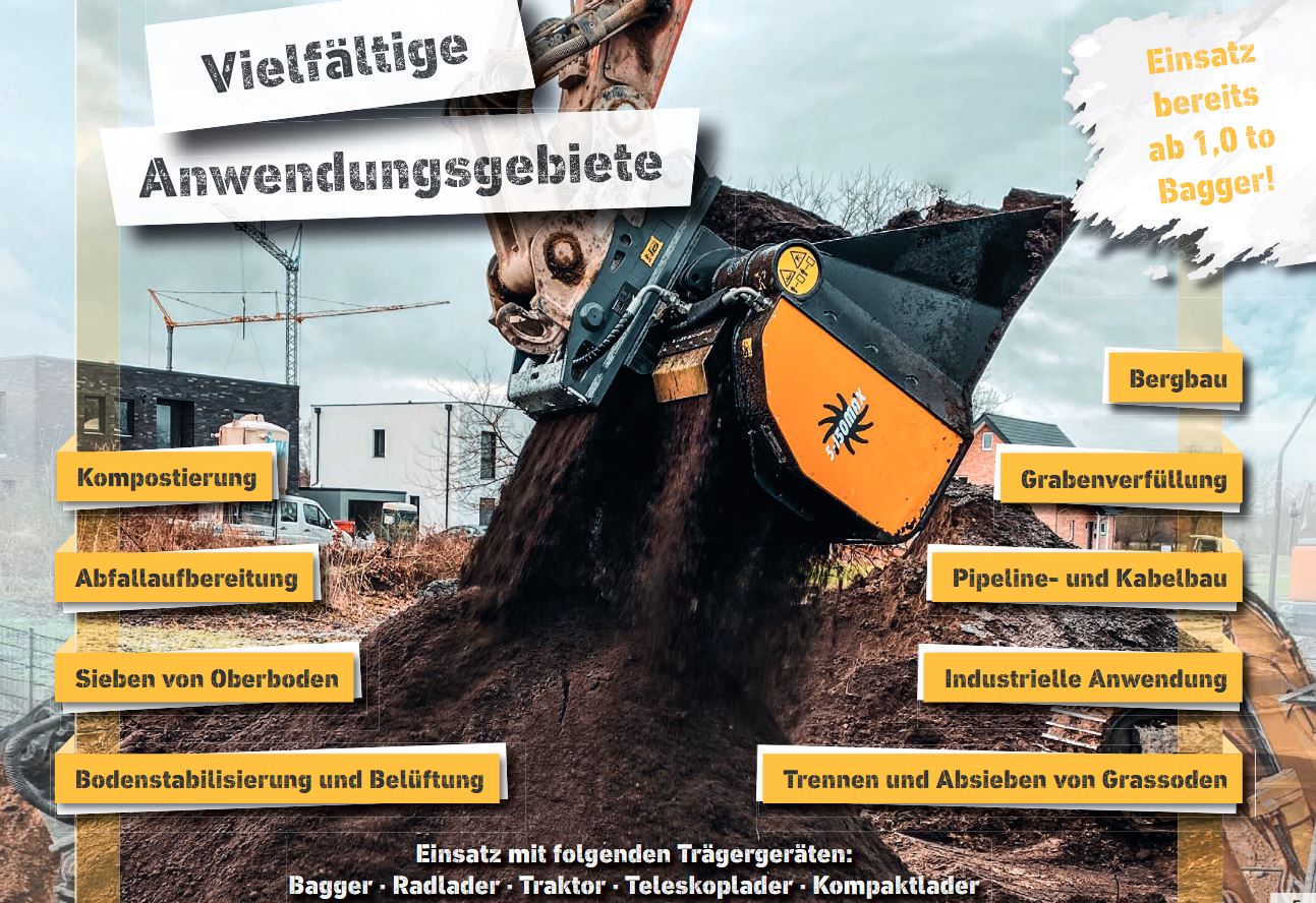 Mit dem Schaufelseparator kannst Du effektiv Sieben, Trennen, Zerkleinern, Auflockern, Mischen, Dosieren, Stabilisieren, Sortieren, Recyclen, Aufbereiten, Verladen, Auffüllen und / oder Belüften von vielen verschiedenen Materialien wie Erde, Schmutz, Torf, Mulch, Abbruch, Bauschutt, Abfälle, Grassoden, industrielle Nebenprodukte, gefrorene Materialien und vieles mehr.