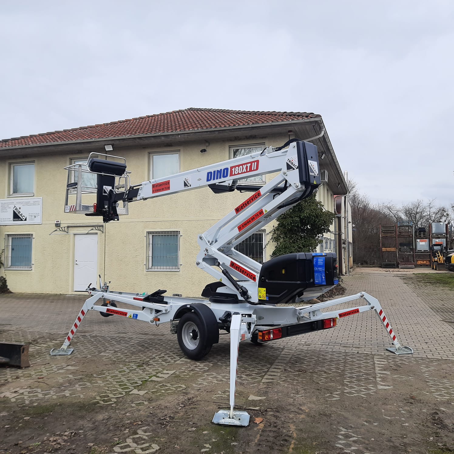 Die DINO180XTII ist das Reichweitenwunder unter unseren Anhängerbühnen. Zusammen mit dem hohen Gelenkpunkt der bei ca. 5 m liegt kann die Maschine spielend bauseitige Hindernisse überwinden. Daher ist die DINO 180 XT II bei Dachdeckern extrem beliebt da hier Kompaktheit und Reichweite zählen.