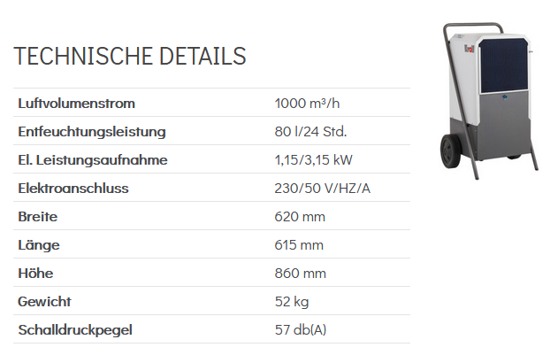 | Ausstattung | Luftentfeuchter/Bautrockner mit Zusatzheizung, optional mit Hygrostat, Kondensatpumpe oder Überlaufsicherung für externe Behälter |