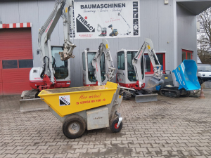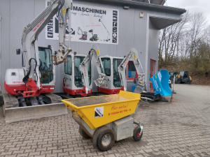 Der Minidumper ist mit einem leicht zu bedienenden Kontrollhandhebeln ausgerüstet. Für sicheres Fahren im Gelände ist die Hinterachse serienmäßig mit einer 20° pendelnden Hinterachse mit drehbahren Mitlaufrädern ausgestattet. Nasse Materialien können bei einem Kippwinkel von 90° problemlos entleert werden. Die Gel-Batterien haben bis zur nächsten Aufladung eine Betriebsdauer von bis zu 5 Stunden.