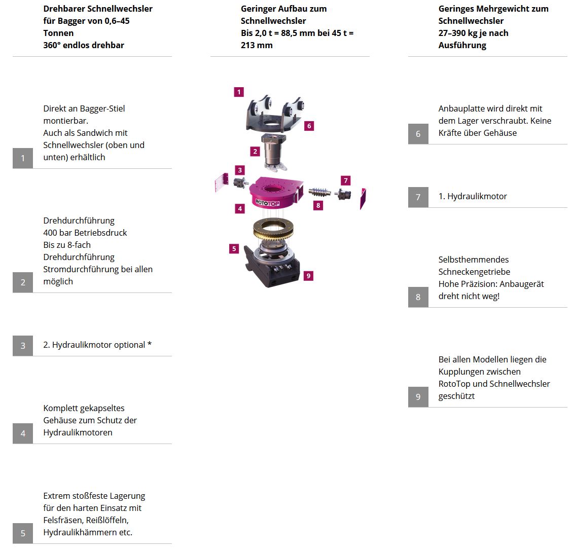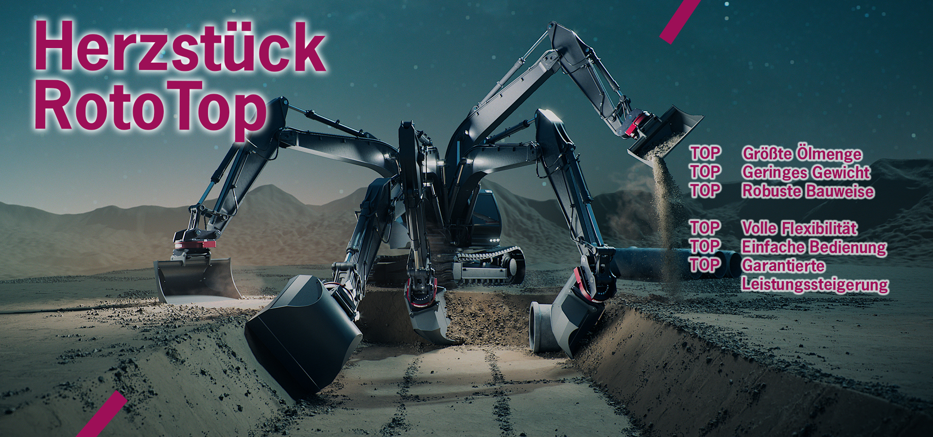 Viele seiner konstruktiven Merkmale sind einzigartig auf dem Markt. Im In- und Ausland ist der ROTOTOP® seit mehr als 10 Jahren auf Erfolgskurs und stellt tagtäglich seine Leistungsstärke unter Beweis. Dieser innovative Drehantrieb, nimmt nicht nur in Bezug auf Eigengewicht, Drehmoment und niedrige Bauhöhe eine Spitzenstellung bei Bagger-Drehantrieben ein.
