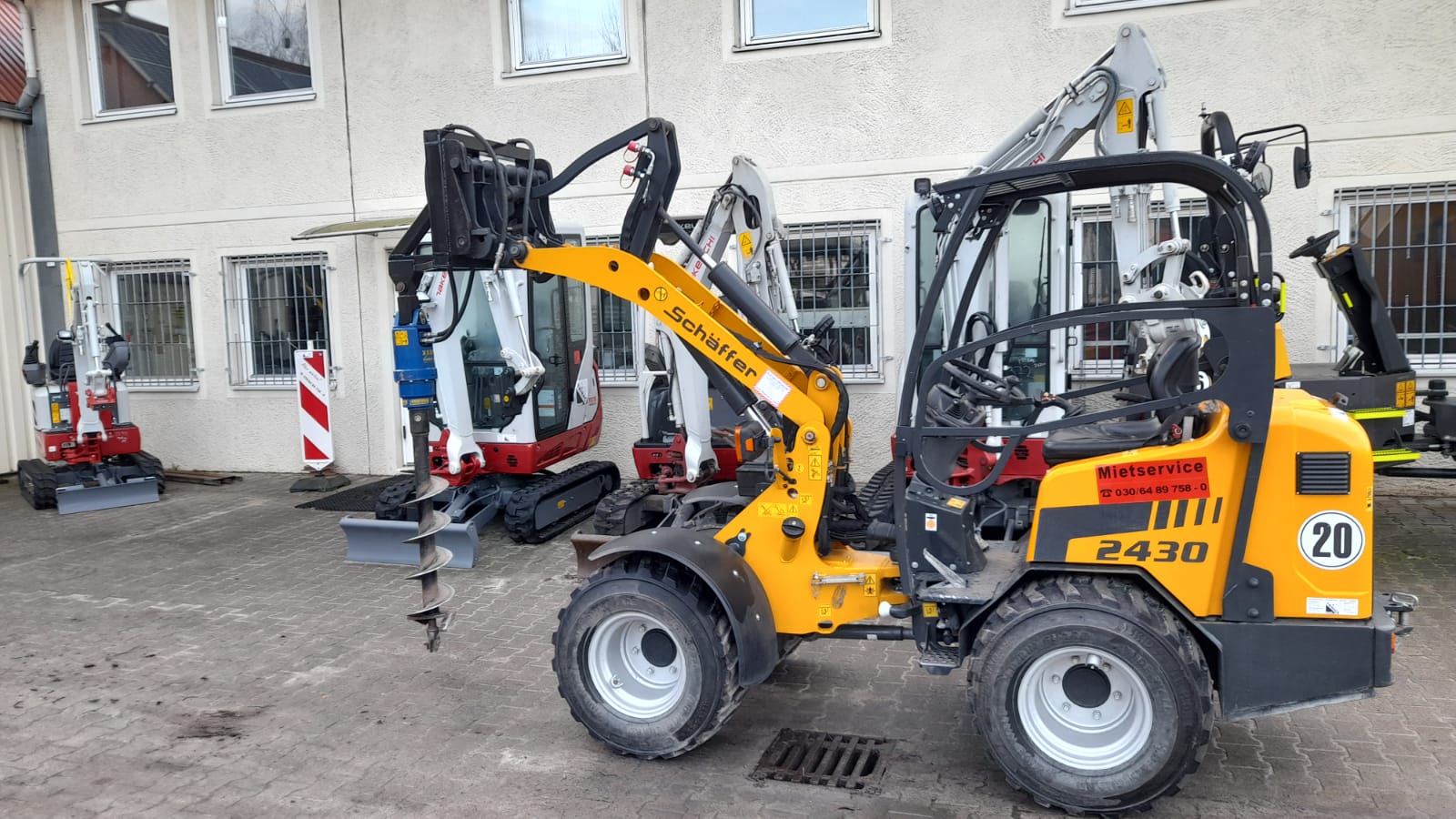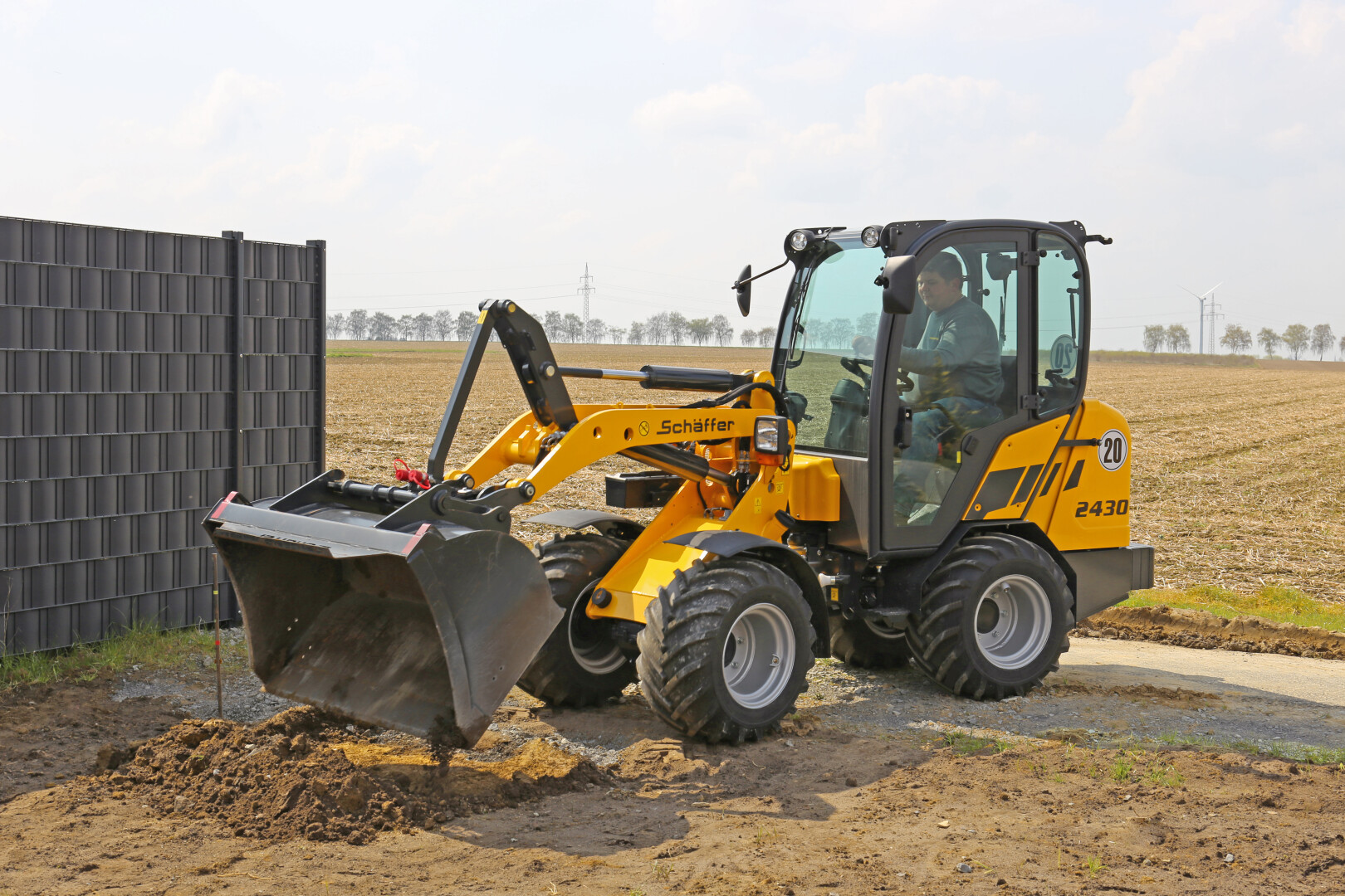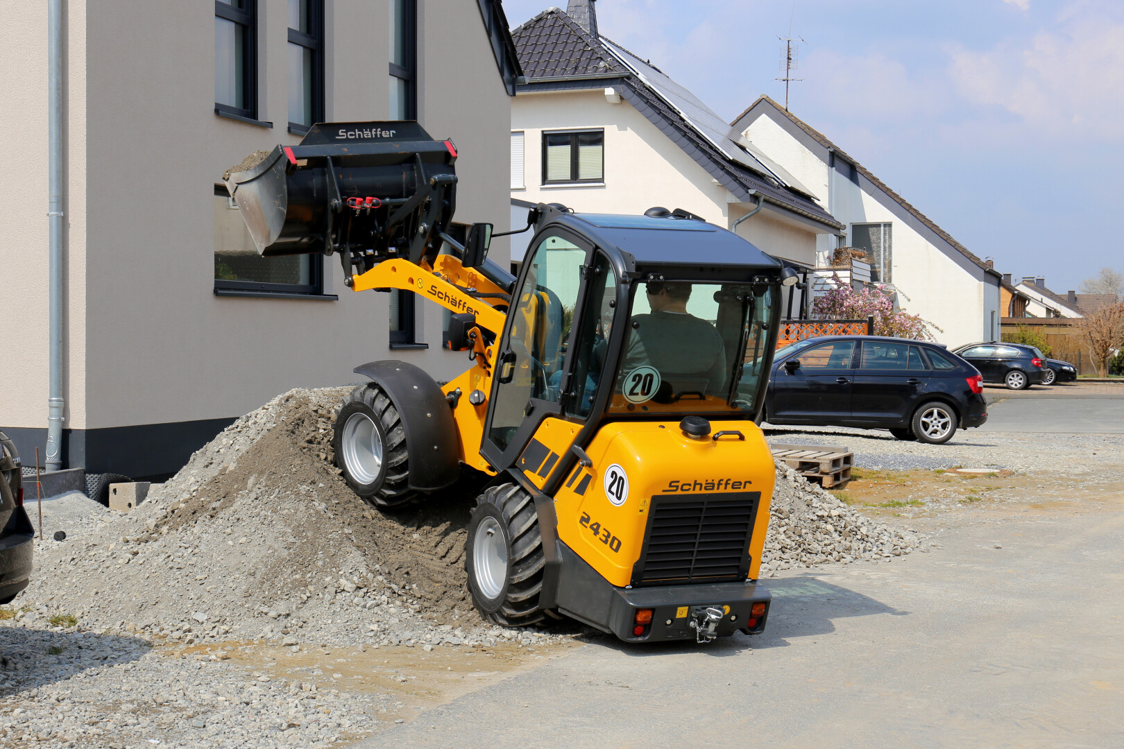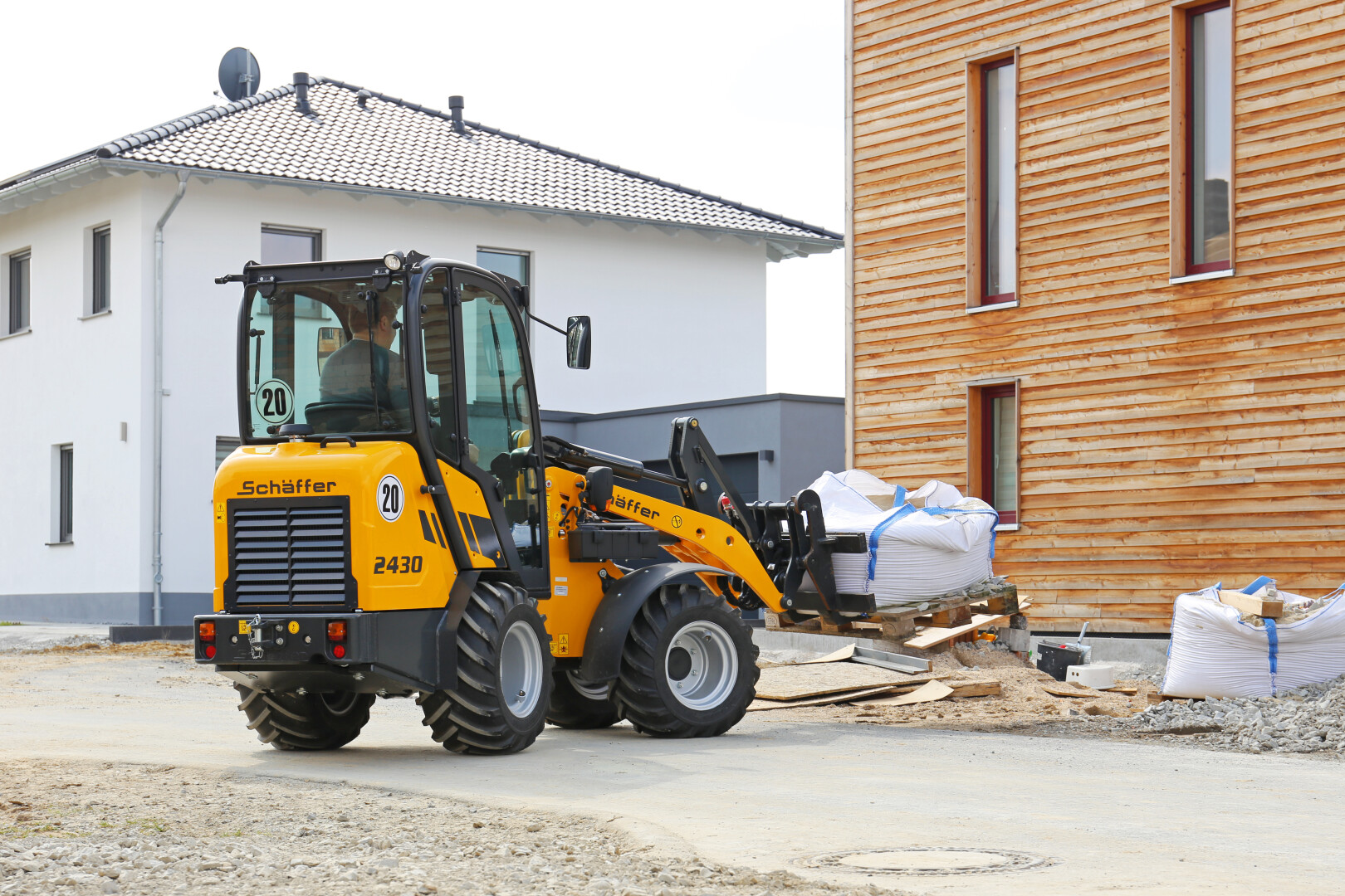 Der Schäffer 2430 (SLT) plaziert sich als äußerst vielseitiger und effizienter Kompakt-Radlader am Markt. Das Einsatzgewicht beträgt je nach Ausstattung zwischen 2,4 und 2,6 t. Trotz dieses sehr niedrigen Gewichts ist die Maschine in der Lage, bis zu 1,9 t schwere Pflastersteinpaletten zu verfahren.